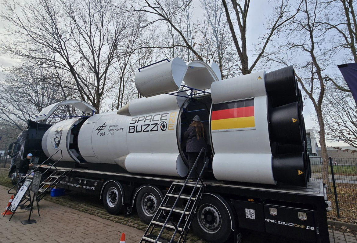 Während einer Klassenfahrt nach Paderborn wurden wir auf den SpacebuzzOne aufmerksam. Äußerlich einer liegenden Rakete ähnlich, entpuppt sich der SpacebuzzOne als begehbarer High-Tech-LKW des Deutschen Zentrums für Luft- und Raumfahrt (DLR). In seinem Inneren erleben die Teilnehmenden mithilfe von Virtual-Reality-Technologie und beweglichen Sitzen einen virtuellen Flug ins Weltall.